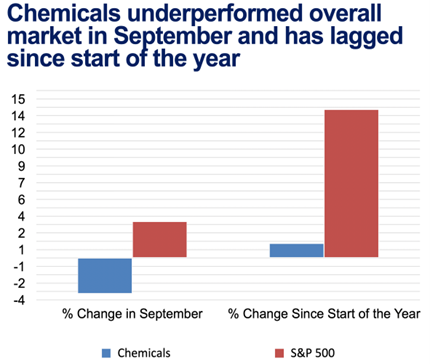 The global chemical industry has experienced several years of downcycle, resulting from overcapacity and structural and competitive challenges. In September, chemicals have underperformed in the overall market, and the sector has lagged since the start of the year. Even though demand for specialties and fine chemicals increased in August, only 13 out of 30 market segments expanded. This includes pharmaceutical ingredients, catalysts, lubricant additives, mining chemicals, oilfield chemicals, and textile specialties, all of which featured strong gains. Coatings, corrosion inhibitors, dyes, electronic chemicals, and industrial & institutional cleaners also moved up. Among basic chemicals and other synthetic materials there was improvement in chlor-alkali, pigments, other inorganic chemicals, bulk petrochemicals, downstream organic intermediates, and plastic resins during August.